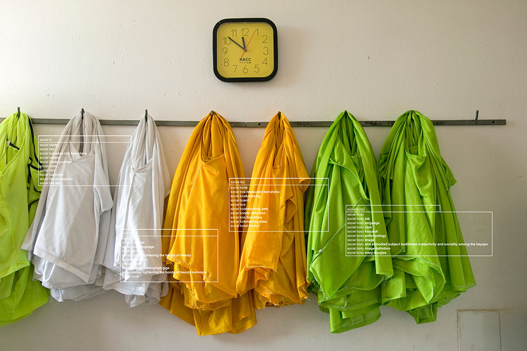 A "social bo|" cedeixo als algoritmes d'un cercador d'internet la feina de construir sentit a partir d'una imatge fotogràfica sobre de la pertinença a un col·lectiu. Serigrafio al damunt de la fotografia els resultats del cercador en escriure social body.